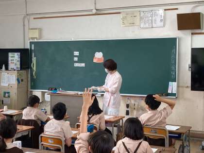 4年生対象に咀嚼チェックガム体験とフッ化物洗口を実施しました。まずは説明をしてもらいました。