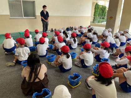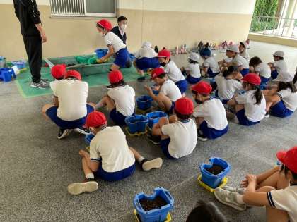 3年生が去年使った鉢にマリーゴールドとホウセンカを植えます。