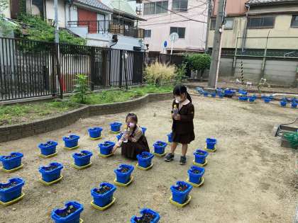 植えた朝顔に水をあげています。芽も出てきましたよ。