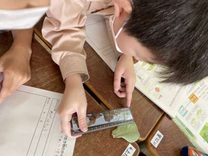 アゲハのさなぎ、アゲハの幼虫、モンシロチョウの卵を観察しています。