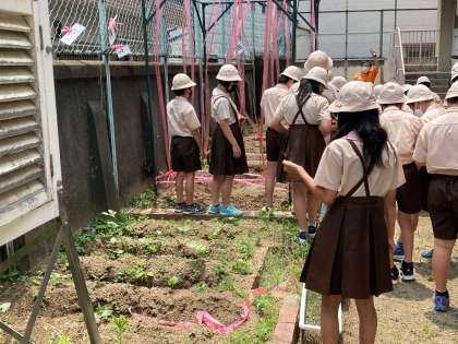 学習園に植えられたさつまいもやひょうたんの成長を確認しています。