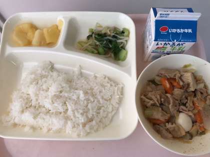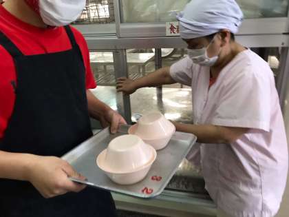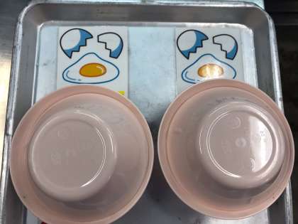 今日の献立の八宝菜は、うずら卵の個別対応献立でした。うずら卵が食べられない人に、うずら卵が入っていない除去食を提供します。除去食を食べる人の札があり、間違いがないか確認した後、調理員さんから担任の先生に直接手渡されます。