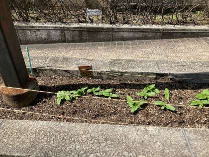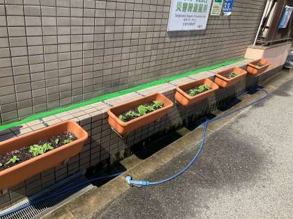 正門前と池の前に、ミニひまわりを植えてくれました。咲くのが楽しみです。