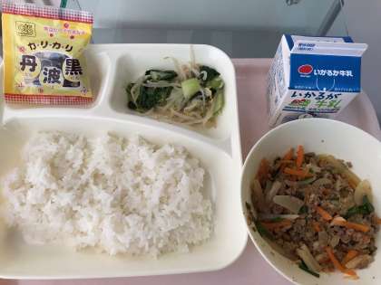 今日の献立のマーボーはるさめは、牛ひき肉、豚ひき肉、はるさめ、たまねぎ、にんじん、たけのこ等を使用し、トウバンジャンで少し辛味をきかせた味付けでした。児童のみなさんに好評な、ごはんのすすむ献立でした。