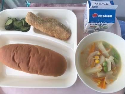 今日の献立の豆乳スープは、ベーコンでうまみを出し、じゃがいも、たまねぎ、コーン、にんじん、むきえだまめを使用した、豆乳のまろやかさを生かしたスープです。豆乳をはじめて食べた児童の人から、『食べたことなかったけどおいしかった!』という声も聞かれました。