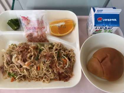 今日の献立の和風焼きそばは、豚肉といかと野菜が入った、しょうゆ味の焼きそばです。ジメジメした天気でもあっさりと食べられて、児童のみなさんに好評な一品でした。