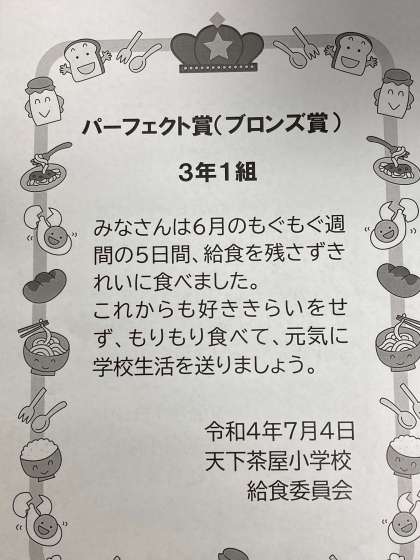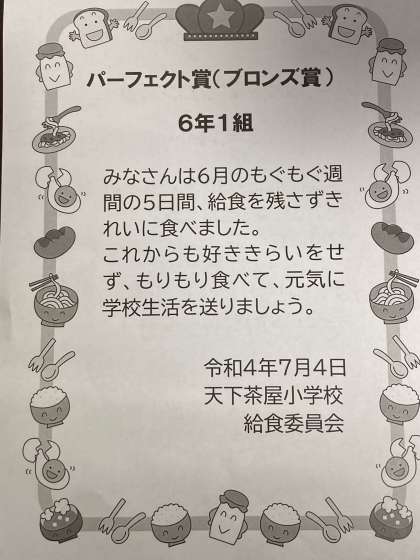 「どのクラスも残食が少なかったです。よく頑張りました。1人1人があと一口食べれば、おかずやパン、牛乳の残る量は減らせます。これは好き嫌いだけでなく、ゴミを減らすこと、水を汚さないことなどの自然環境の保護もっといえばSDGsにつながります。これからも、少しでも残さない日を増やしていきましょう!」
