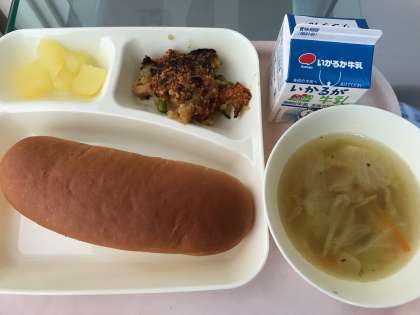 今日の献立のカレードリアは、具材を炒めて米と合わせて煮、ミニバットに入れて焼物機で焼いています。暑い時期でも食べやすいようにカレー味にしています。