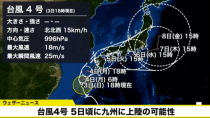台風4号が5日頃九州に上陸する可能性があります。台風情報ご注意ください。ホームページの【配布文章】「お知らせ・お願い」に臨時休業となる場合についてを掲載しておりますのでご確認ください。下記の赤字をクリックして頂くと閲覧できます。