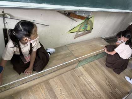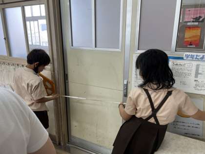教室の長さを実際に巻き尺で測っています。数値を知るのではなく、体感しながら知ることが大切です。