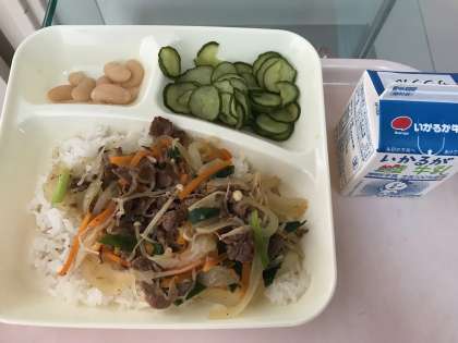 今日の献立の牛丼は、牛肉、糸こんにゃく、たまねぎ、にんじん、青ねぎ、えのきたけを甘辛く味付けして煮ています。児童のみなさんにとても好評な、ボリュームある一品でした。