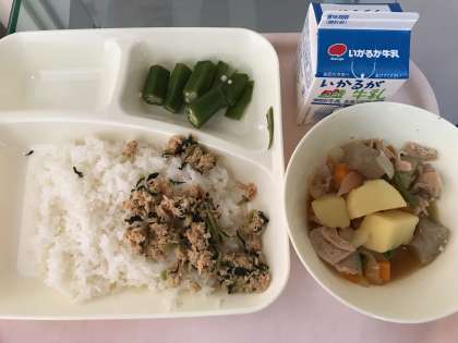 今日の献立のオクラの梅風味は、今が旬のオクラを焼物機で蒸し、梅肉、砂糖、米酢、うすくちしょうゆで作った調味液で和えています。