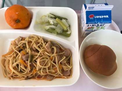今日の献立のチキントマトスパゲッティは、鶏肉、ウインナー、たまねぎ、トマト缶、にんじん、ピーマン、バジルの入ったトマト味のスパゲッティです。さっぱりとした味で食べやすい一品でした。