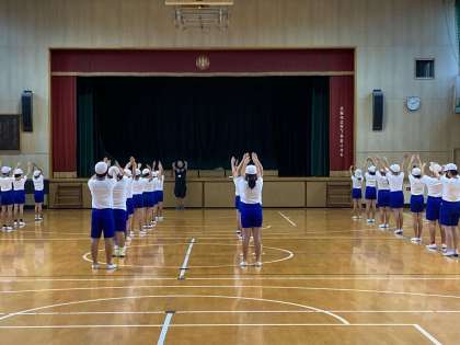 5年生は体育館でラジオ体操をしています。