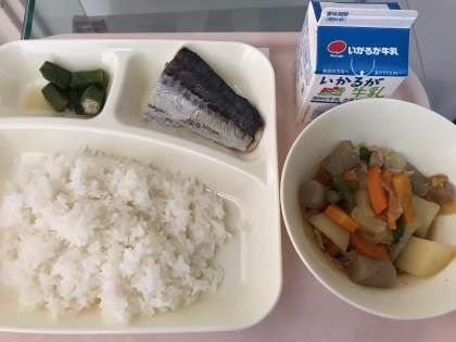 今日の献立の豚肉とじゃがいもの煮ものは、豚肉、じゃがいも、つなこんにゃく、たまねぎ、にんじん、さんどまめが入った煮物です。けずりぶしの風味がよくきいた、とても美味しい一品でした。
