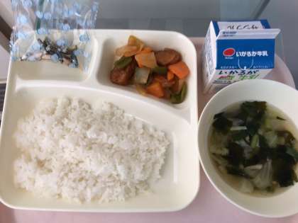 今日の献立の豚肉は、衣をつけて油で揚げた豚肉と、いためたたまねぎ、にんじん、ピーマンを甘酢あんで味付けしています。