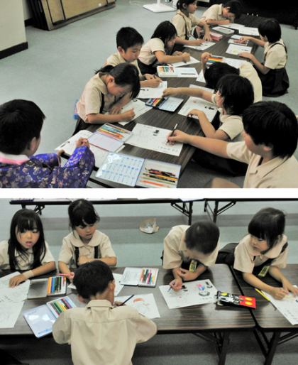 説明を聞き、塗り絵を使って民族衣装について学びました。