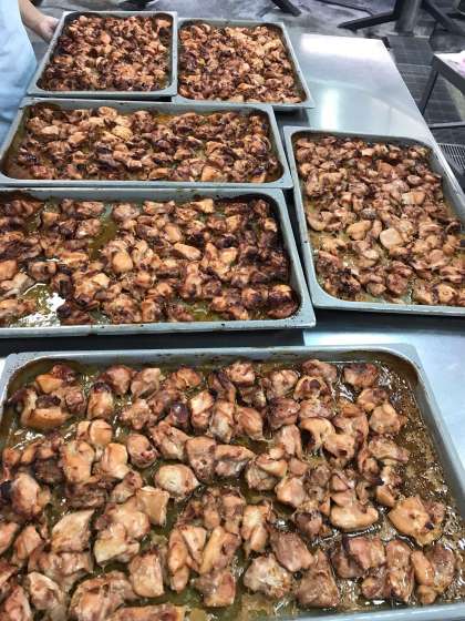 今日の献立の鶏肉のてり焼きは、料理酒、砂糖、みりん、こいくちしょうゆで下味をつけた鶏肉を、焼物機で焼いています。甘辛い味付けが食欲をそそる、とてもおいしい一品でした。