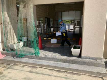 外壁工事の為、今週の木曜日まで正門からまっすぐには、運動場には出れません。