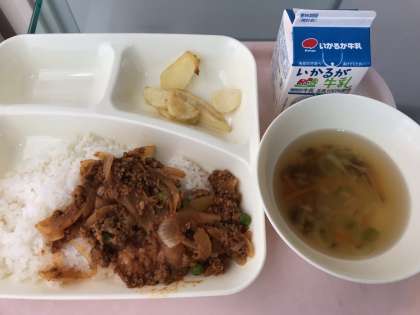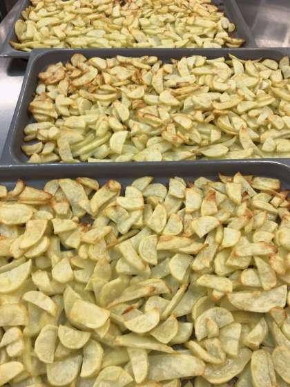 今日の献立の焼きじゃがは、塩と綿実油で下味をつけたじゃがいもを、焼物機で焼いています。素朴な味のとても美味しい一品でした。