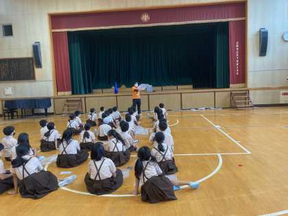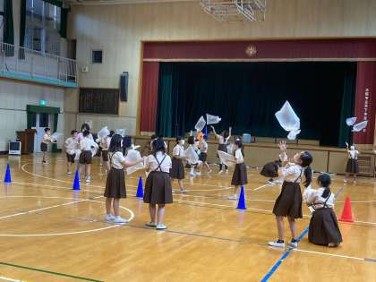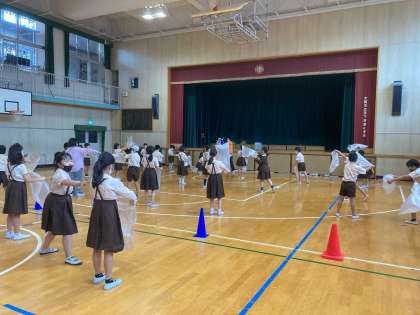 空気を実感するため、ビニールに空気を入れて飛ばしたり押したりしました。広い体育館で行いました。
