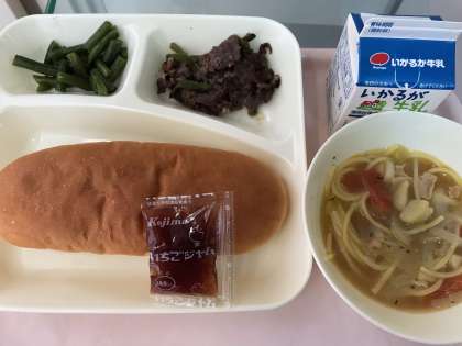 また、はたて貝とトマトのスープスパゲッティは、「すごくおいしかった!!来月も出して欲しい!」という児童の声が聞かれました。ほたてと素材の旨味がたっぷり感じられる、こちらもとてもおいしい一品でした。