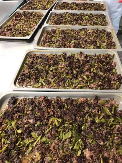 今日の献立の牛肉の香味焼きは、牛肉にワイン、塩、こしょう、オールスパイス、ウスターソース、オリーブ油で下味をつけ、ピーマンを混ぜ合わせて焼物機で焼いています。とても食べやすく、おいしい一品でした。