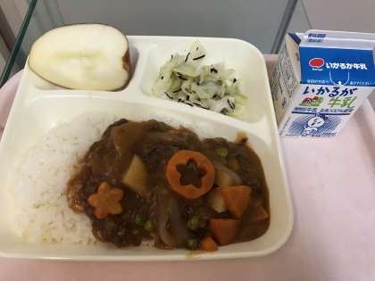 今日の献立のハヤシライス[米粉]は、小麦アレルギーのある人でも食べられるように上新粉を使っています。今日のハヤシライスにはラッキーにんじんが入っていました。調理員さん、いつも美味しくて楽しい給食を作ってくださりありがとうございます。