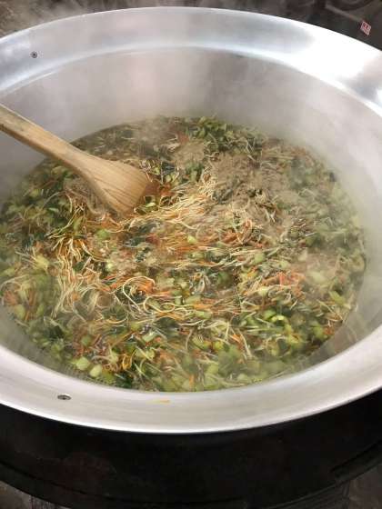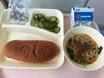 今日の献立のタンタンめんは、豚骨スープを使用し、チンゲンサイ、もやし、にんじんを使った汁めんに、ひき肉、白ねぎ、しょうが、ニンニクを使い、テンメンジャンや赤みそなどで味付けした肉みそを配食時にのせて食べます。