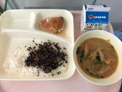 今日の献立のあかうおのみぞれかけは、塩で下味をつけ、焼物機で焼いたあかうおに、みりん、うすくちしょうゆ、ゆず果汁で味つけした大根おろしをかけています。ゆずの風味が大根おろしとよく合い、とてもおいしい一品でした。
