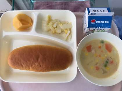 今日の献立の豆乳コーンクリームシチューは、小麦アレルギーの人でも食べられるように、上新粉でとろみをつけています。また、乳アレルギーの人でも食べられるように、牛乳ではなく豆乳を使っています。具沢山で、あっさりした仕上がりのおいしいシチューでした。