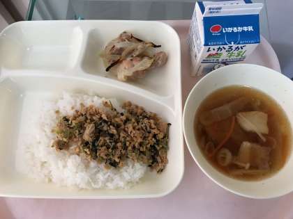 ツナ大豆そぼろは、ツナ、ひきわり大豆、だいこん葉を甘辛くいためたごはんにとてもよく合う一品でした。