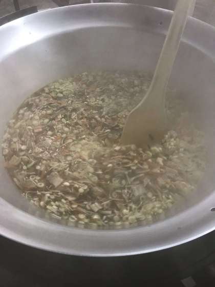 今日の献立のソーキ汁は、豚のばら肉と切りこんぶなどを使用した沖縄の郷土料理です。豚のばら肉は、よく下茹でをして余分な脂を落としてから使用しています。素材の味と旨味がとてもよく感じられるおいしい一品でした。