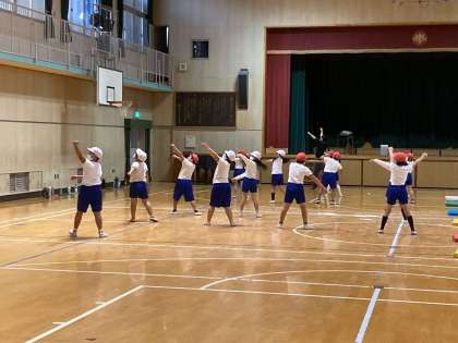 3年「マット運動」英語バージョンのラジオ体操で準備体操。