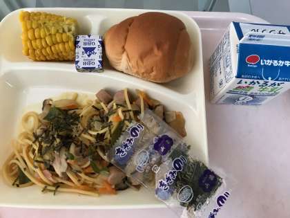 今日の献立のウインナーときのこの和風スパゲッティは、季節の食材のしめじ、しいたけのほかに、ウインナー、ベーコン、たまねぎ、にんじん、ピーマンが入った、しょうゆベースの和風の味つけにしています。あっさりとしていて、とてもおいしい一品でした。