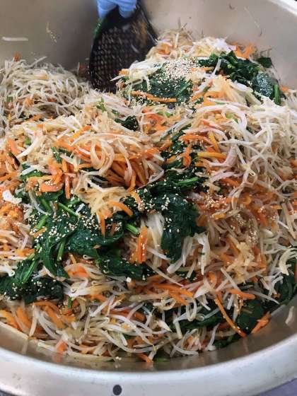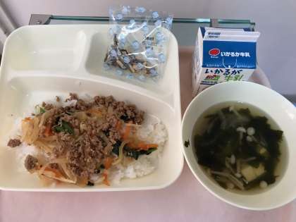 今日の献立のビビンバは、韓国・朝鮮の混ぜごはんです。牛ひき肉、豚ひき肉を主材に、旬のだいこん、ほうれんそう、もやし、にんじんを使用しています。肉は肉、野菜は野菜で別調理をし、配食時にごはんにかけて食べる、とても手間のかかった献立です。おいしさは抜群で、どのクラスもしっかり食べられていました。