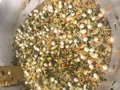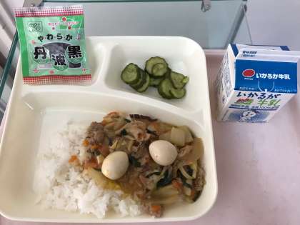 今日の献立の中華丼は、豚肉、うずら卵、はくさい、たまねぎ、たけのこ、にんじん、しいたけ、にらが入った具だくさんの丼です。また、今日は卵が食べられない人でも食べられる、うずら卵を除去した個別対応献立でした。