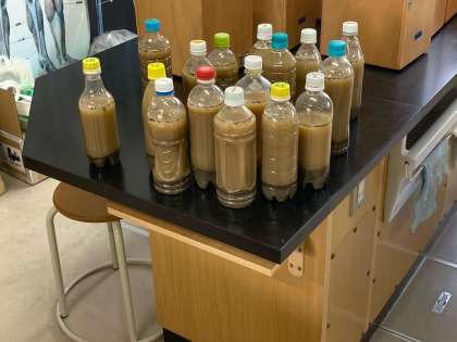 地層の成り立ちを観察するために、ペットボトルに泥水を入れて見ます。