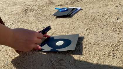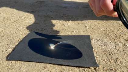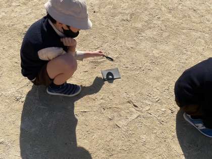 理科の虫眼鏡で日光を集める実験をしています!