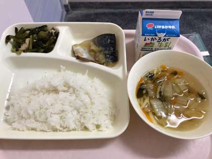 今日の献立のさばのみぞれかけは、塩で下味をつけたさばを焼物機で焼き、だいこんおろし、みりん、うすくちしょうゆ、ゆず果汁で作ったタレをかけています。油の乗ったさばに、さっぱりとした酸味のあるタレがよく合い、とてもおいしい一品でした。