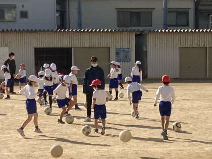 2年生は「サッカー」の練習です。3学期にはミニゴールも設置します。