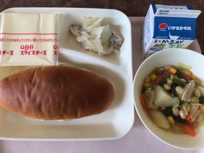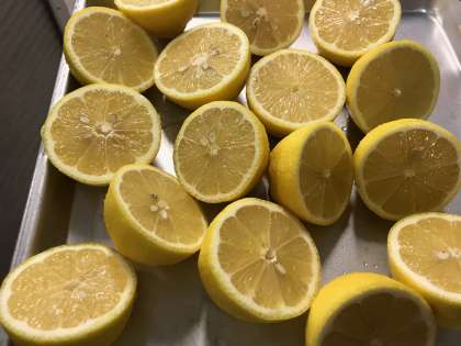 今日の献立のあじのレモンマリネは、1人1枚のあじに衣をつけて油であげ、いためたたまねぎとレモン汁などで作った調味液をからませています。レモン汁は、和歌山県産の生のレモンを給食室でしぼっています。フレッシュで、優しい酸味のレモンの風味があじによく合い、とてもおいしい一品でした。
