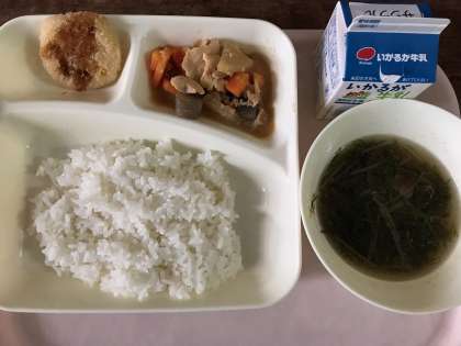 今日の献立は、令和3年度学校給食献立コンクール最優秀賞に選ばれた献立です。生徒が考えた【献立のねらい】は、「牛すじ肉のかわりに鶏肉を使用し野菜も加えて彩りをよくした鶏肉の土手焼き風と、大阪名物のはりはり鍋をアレンジしたはりはり汁、大人気の串カツ店風のソースをかけたれんこんのフライという大阪の名物や郷土食を集めて大阪定食にしました」とのことです。