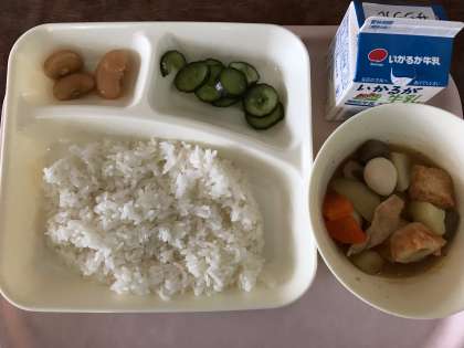 今日の献立の関東煮は、鶏肉、うずら卵、ちくわ、じゃがいも、こんにゃく、あつあげ、だいこん、にんじんが入っています。たくさんの素材の味が合わさった、とてもおいしい一品でした。