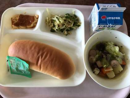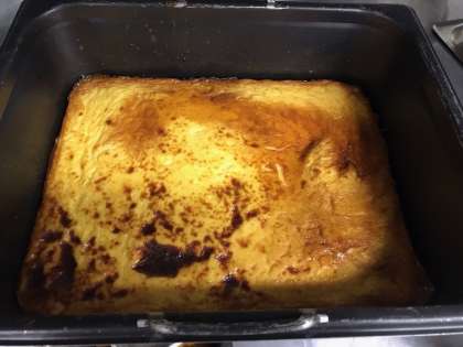 今日の献立の焼きプリンは、ミニバットに手作りのカラメルソースをしき、卵、牛乳、クリーム、砂糖を混ぜ合わせて入れ、焼物機で蒸し焼きにしています。手作りのプリンは卵と牛乳の味がしっかりと感じられる、とてもおいしい一品でした。