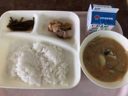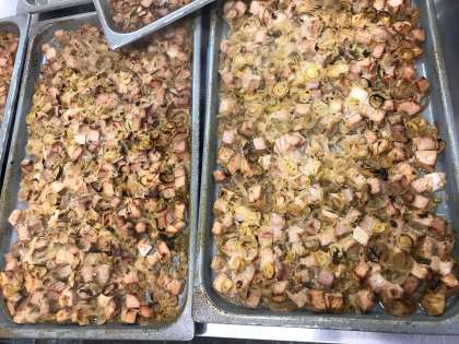 今日の献立のまぐろの甘辛焼きは、砂糖、みりん、こいくちしょうゆなどで下味をつけたまぐろと白ねぎを混ぜ合わせ、焼物機で焼いています。まぐろと白ねぎの相性がよく、とてもおいしい一品でした。