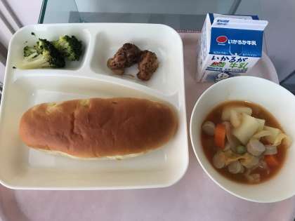 今日の献立のウインナーと野菜のケチャップ煮は、ウインナー、じゃがいも、たまねぎ、キャベツ、にんじん、グリンピースが入っています。温かく、食べやすい一品でした。