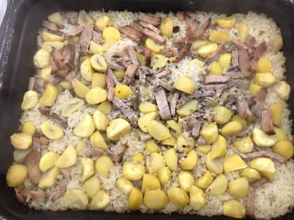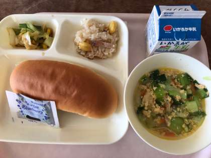 今日の献立の中華おこわは、もち米に焼き豚、くり、しいたけ、調味液を加えて、焼物機で蒸し焼きにしています。チキンブイヨンとごま油でコクと旨みを出しています。とてもおいしい一品でした。