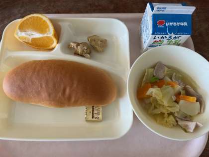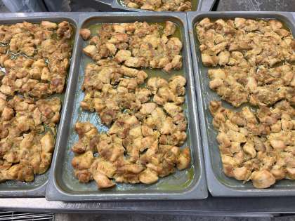 今日の献立の鶏肉のカレー風味焼きは、鶏肉にワイン、塩、粗挽こしょう、ガーリック、カレー粉、綿実油で下味をつけ、焼物機で焼いています。カレーの風味が食欲をそそるおいしい一品でした。