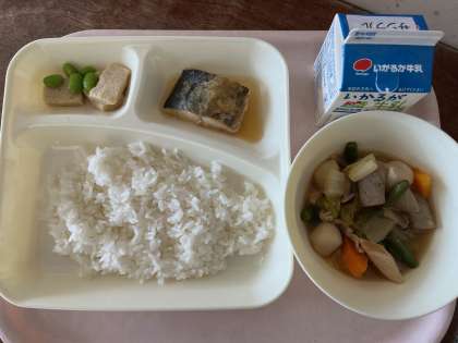 今日の献立のさといもと野菜の含め煮は、鶏肉、さといも、つなこんにゃく、たまねぎ、にんじん、はくさい、さんどまめ、しめじが入っています。具沢山でだしと素材の味が合わさって、おいしい一品でした。